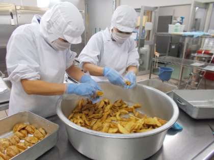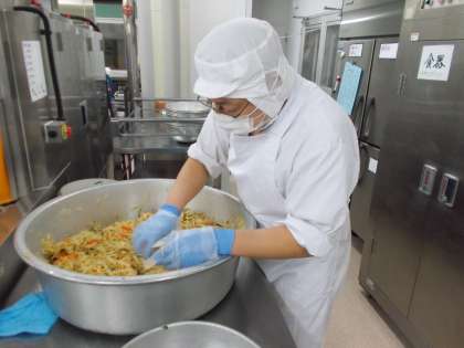 今日は、いつもの茹で野菜の味つけにおろしたにんにくを入れました。味にアクセントがありわかめうどんにもぴったりでした。カントリーポテトは、新じゃがをつかったので、水分がありカラッと揚げるためにじっくり低温で揚げました。芋の甘さとほくほく感が感じられ大好評でした。