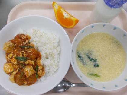 献立 ごはん 豆腐のチリソース たまごとコーンのスープ はるみ 牛乳