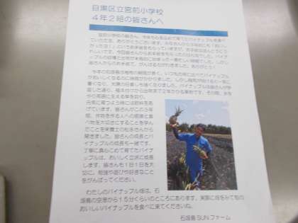 先日も生産者からの手紙を紹介しましたが、今日も5月の時に石垣島からとった石垣島ティーダパインの生産者からの手紙を4年生に紹介しました。4年生は1年生の時と、4年生と時と2回に渡り、同じ生産者の方にお手紙を書いています。「みなさんからのお手紙で、がんばる力がわきました。」「パイナップルは植え付けから出荷まで2年かかり、愛情込めて育てています。「これからも作物を作る人への感謝や、食べ物を大切にすることを学んでください。」と手紙にはしたためられていました。