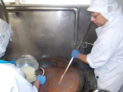 今日は、スパゲティの献立の中でも人気のあるミートソースです。宮前小学校のミートソースは、大豆を細かくして入れてあります。玉ねぎを30キロ近く使い作るので、とても甘みが感じられる味わいです。