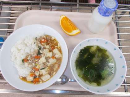 今日のこんだては、四川どうふ、ご飯、チンゲンサイとわかめのスープ、くだもの(清見オレンジ)、牛乳です。
