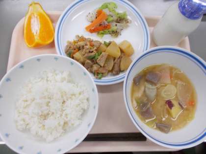 今日の給食は、ごはん、さつまじる、大根と豚肉の煮物、やさいのゆかりあえ、くだもの(はるみ)です。