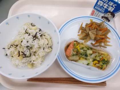 献立 昆布と大豆ご飯 鮭のチャンチャン焼き 五目金平 牛乳