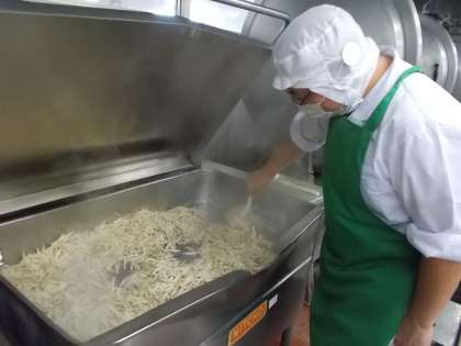 今日は、北海道の郷土料理でした。ちゃんちゃん焼きの由来は、ちゃちゃっと料理できるから、鉄板で焼くとチャンチャンという音を立てるからだそうです。鮭のちゃんちゃん焼きをおいしく食べてもらいたく調理方法を何回も検討し、今に至っています。