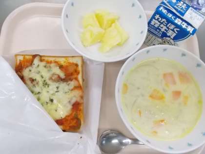 献立 ピザトースト コーンクリームスープ じゃがバター 牛乳