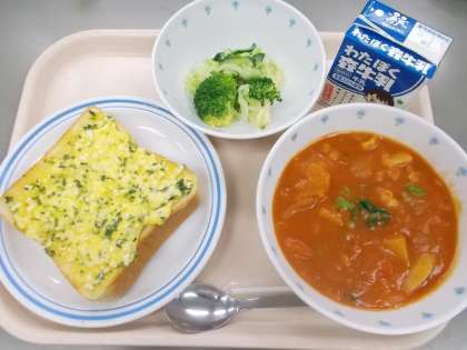 献立 たまごトースト 豆入りトマトシチュー グリーンサラダ 牛乳