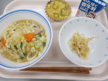 献立 かきたまうどん もやしのごまじょうゆがけ さつま芋入り蒸しパン 牛乳