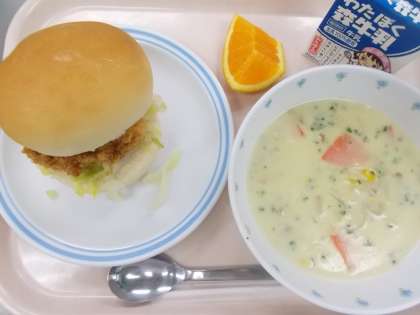 献立 フィッシュバーガー コーンシチュー 清見オレンジ 牛乳