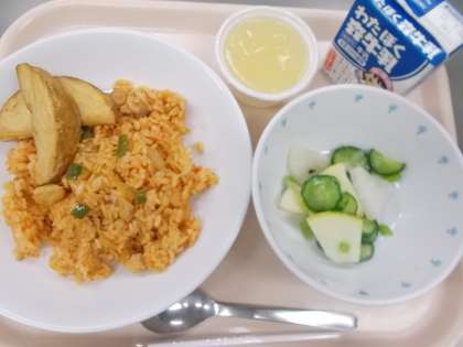 献立 チキンライス カントリーポテト かぶとりんごのサラダ ハニーレモンゼリー 牛乳