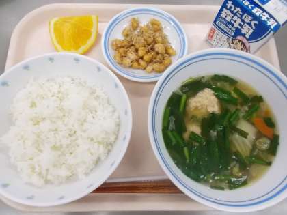 今日は、にらをたっぷりいれたちゃんこでした。肉団子には、しょうがのしぼり汁を入れました。高学年では、しょうがの味に気付いた児童がいました。給食をしっかり味わってくれていて嬉しいです。大豆とじゃこのカリカリ揚げは、いつも通り好評でした。