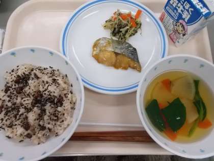 献立 赤飯 すまし汁 鰆の照り焼き のりあえ 牛乳です。