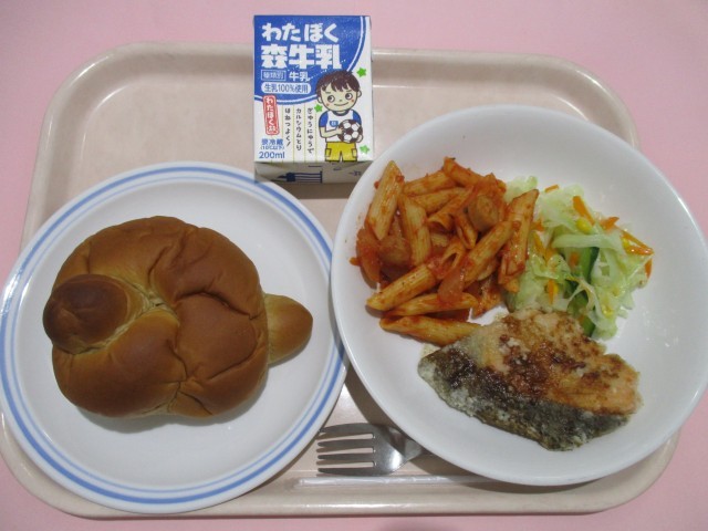 黒砂糖パン  鮭のバルサミコソース  ペンネアラビアータ  コールスローサラダ  牛乳