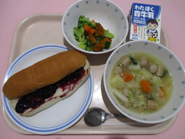 ブルーベリージャムサンド ポトフ ブロッコリーと南瓜の和風サラダ 牛乳