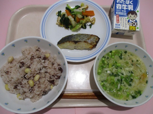 つなひきよいしょ  むらくも汁  鰆の西京焼き  3色浸し  牛乳