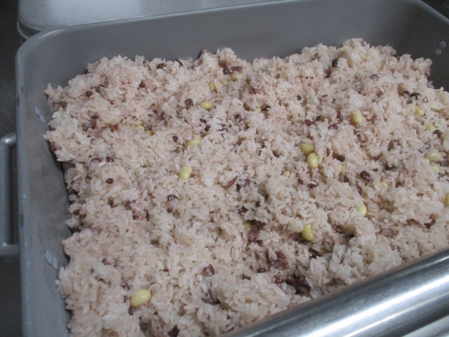 近隣の中学校から教えていただいた献立を取り入れました。「つなひきよいしょ」は、熊本に伝わる民話から作られた、大豆と小豆が入ったおこわです。小豆の茹で汁で炊くので、おこわが赤飯のように赤くそまり、大豆も塩気を帯びて美味しかったです。