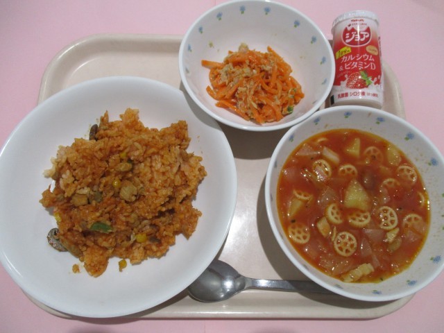 チキンライス  ミネストローネ  人参サラダ 飲むヨーグルト