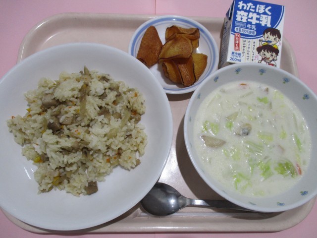 鶏ごぼうピラフ  白菜のクリームスープ  さつま芋のチップス  牛乳