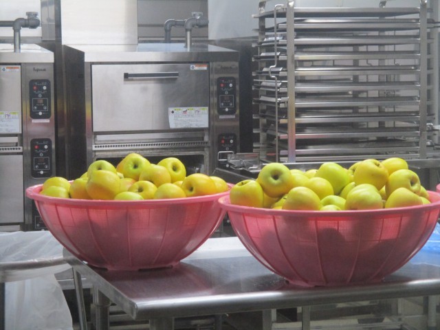 また、果物は「もりのかがやき」というりんごです。黄色の果実が太陽の光を浴びてキラキラ輝いているイメージということで、給食室のガラス窓の外から写真を撮りましたが、一段と光って見えました。