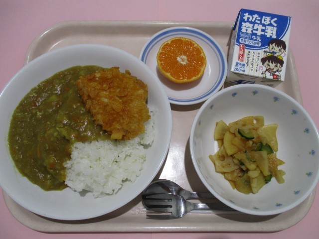 カレーライス パリパリチキン 手作り福神漬け 菊花みかん 牛乳