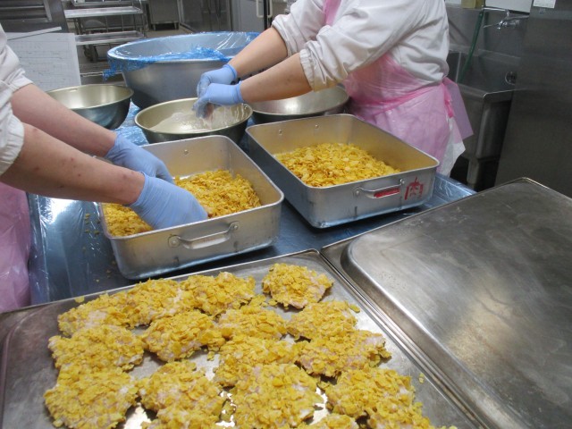 カレーライスに、コーンフレークを衣につけて揚げたパリパリチキンをのせました。子どもたちにも、とても好評でした。