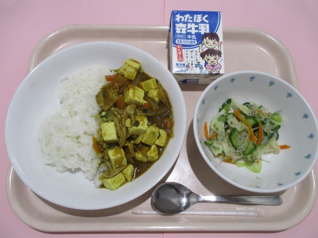 ご飯 カレー豆腐 キャベツとじゃこのサラダ 牛乳