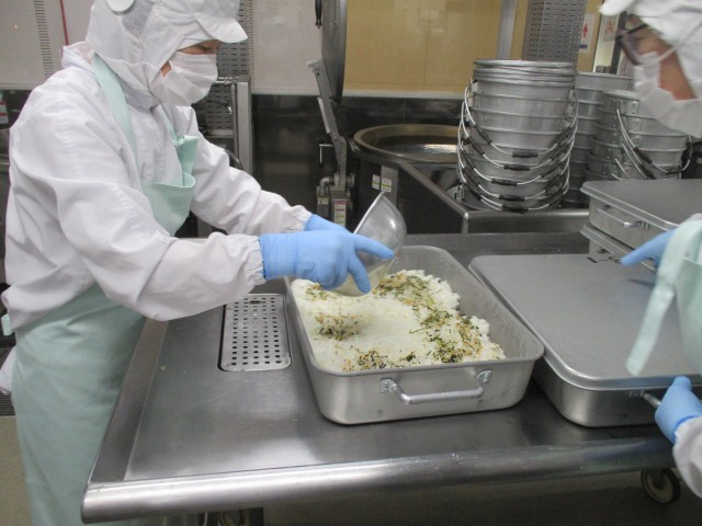 手作りふりかけには、わかめ、じゃこ、ごま、ゆかり、海苔を混ぜ合わせ、ご飯の上にかけていきました。