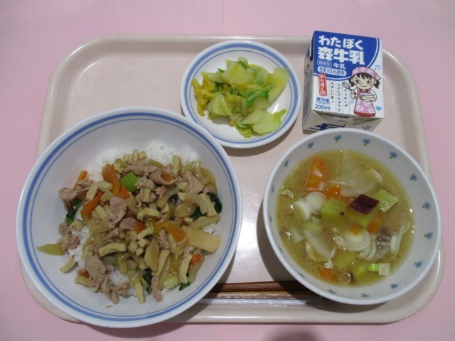 うま煮丼 さつま汁 白菜の香り漬け 牛乳