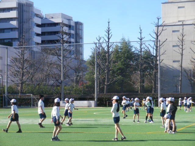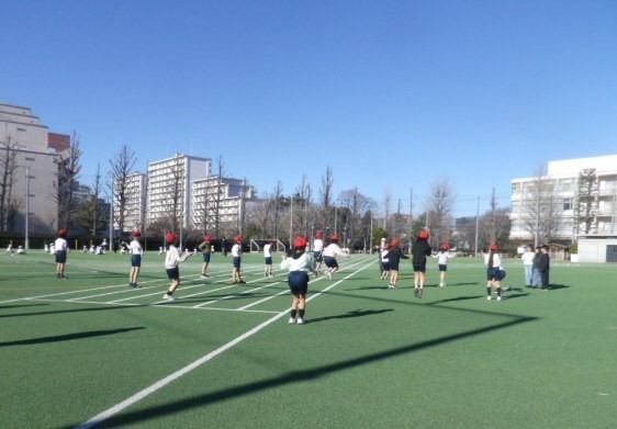冬の青空の下、おにごっこで身体を温めて、二重跳びに挑戦する4年生です。
