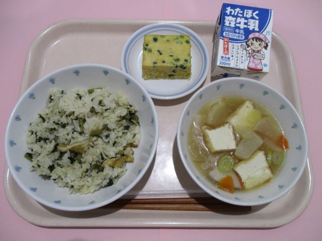 大根葉と油揚げのごはん のっぺい汁 切干大根の卵焼き 牛乳