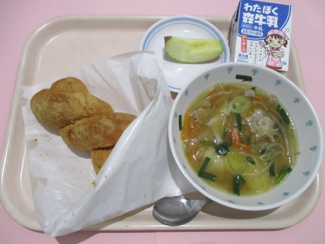 きな粉揚げパン  ワンタンスープ  りんご  牛乳