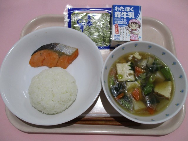 おにぎり 海苔 けんちん汁 鮭の塩焼き 牛乳