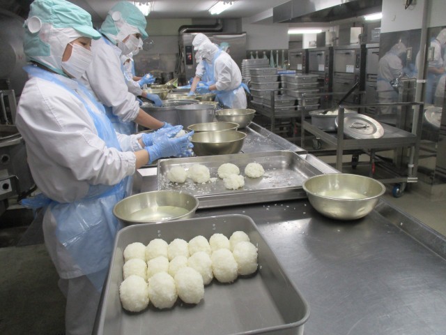 今日は歴史給食として、明治時代の給食を作りました。日本の給食は、明治22年に山形県の小学校でだされた「おにぎり、塩焼き、漬物」が始まりといわれています。