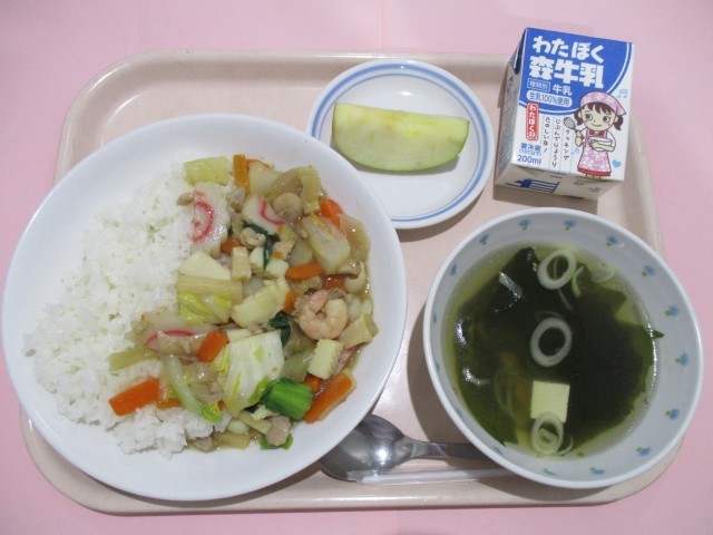 ごはん 中華あんかけ わかめスープ りんご 牛乳
