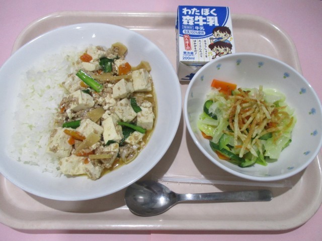 ご飯 四川豆腐 パリパリポテトのサラダ 牛乳