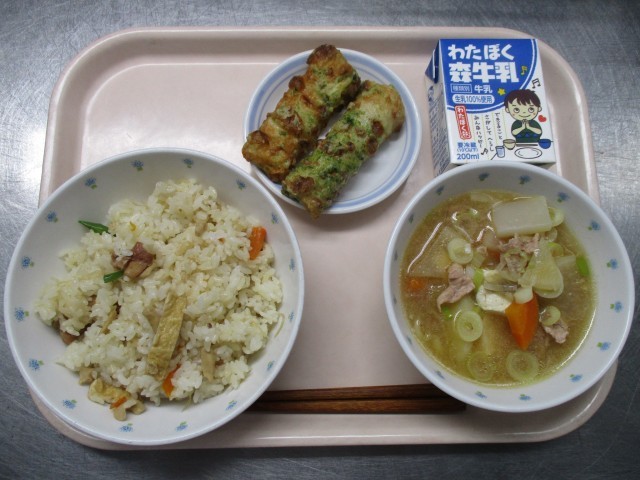 ちくわは1~3年生が1本、4~6年生が2本です。青のり入りの衣をつけて磯部揚げにしました。