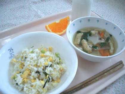 今日のごはんは、いり卵と刻んだ野沢菜づけを混ぜた「菜の花ごはん」。いり卵の黄色を花に、野沢菜の緑を葉にみたて、菜の花畑を表しました。ひまわり校庭の花壇にキャベツが黄色い花を咲かせています。キャベツも菜の花の仲間。春のおとづれを知らせてくれています。