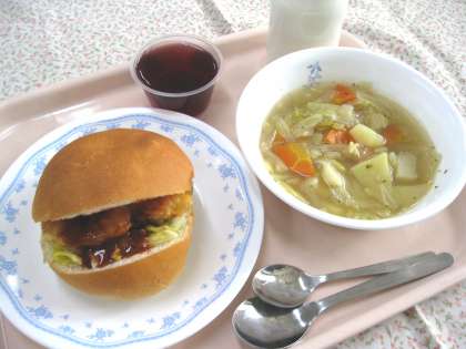 今日の給食には、キャベツがたっぷり使われています。フィッシュサンドにはやわらかい春キャベツを、スープには甘味の増した冬キャベツを用意しました。2種類のキャベツの違いを味わってください。