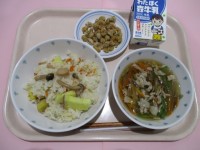 今日は一汁二菜の献立。ごはんは白米です。ごはん、みそ汁、おかずを少しずつ食べる三角食べに挑戦してみてください。みそ汁やおかずの味で、白いご飯を残さず上手に食べることができます。