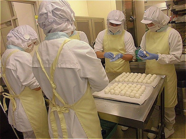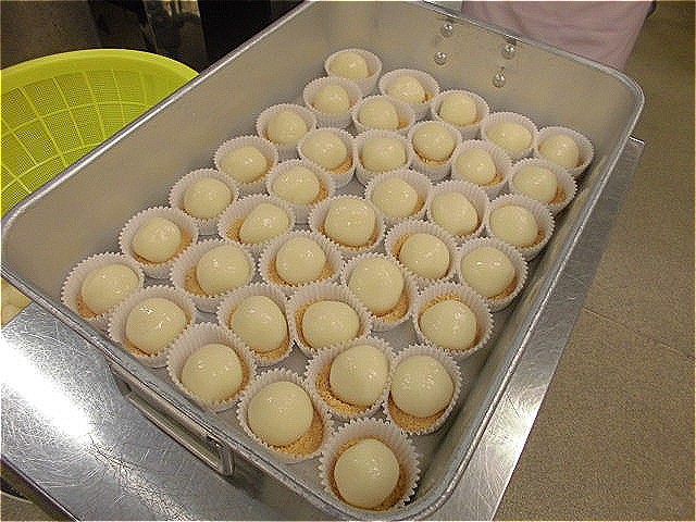 給食では、白玉粉に絹豆腐を加えこね、月のようにまん丸に丸め、