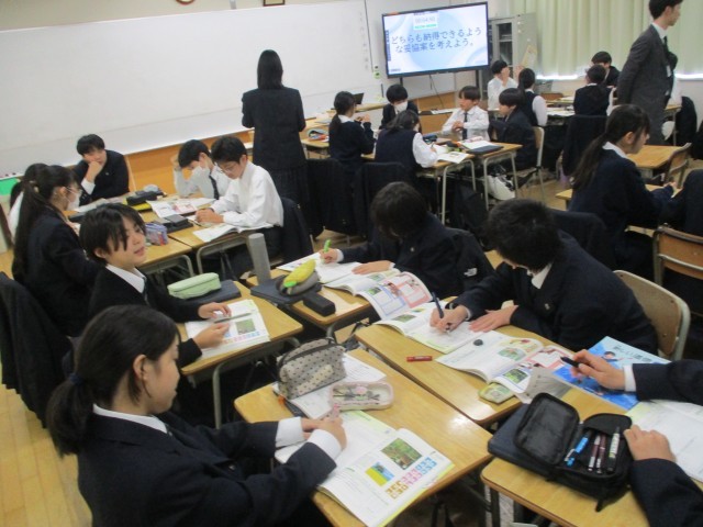 「自然と共生するためには」をテーマに、ある村に新しい道路を作ることについて、賛成か反対かを班で話し合い、考えを深めました。