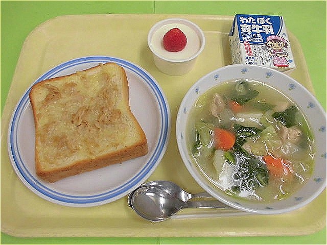 新年最初の給食は、真っ白なヨーグルトゼリーの上に、赤い🍓いちごを