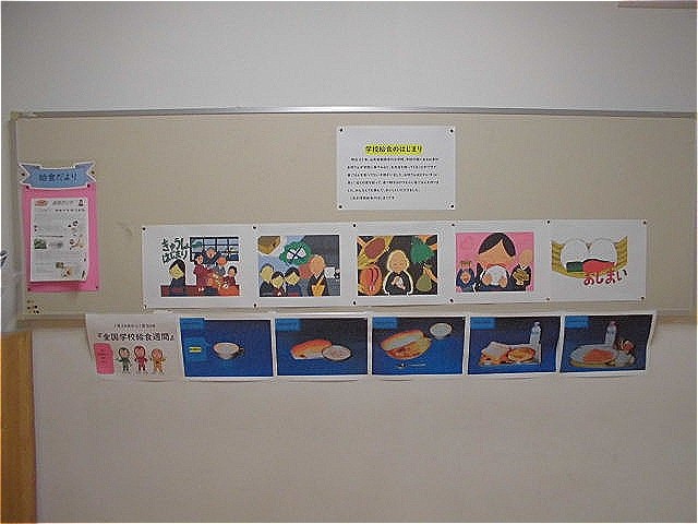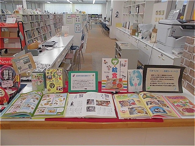 図書コーナーには、学校給食に関連した本が展示されています。保健室前には、