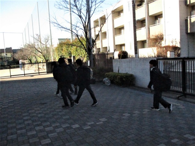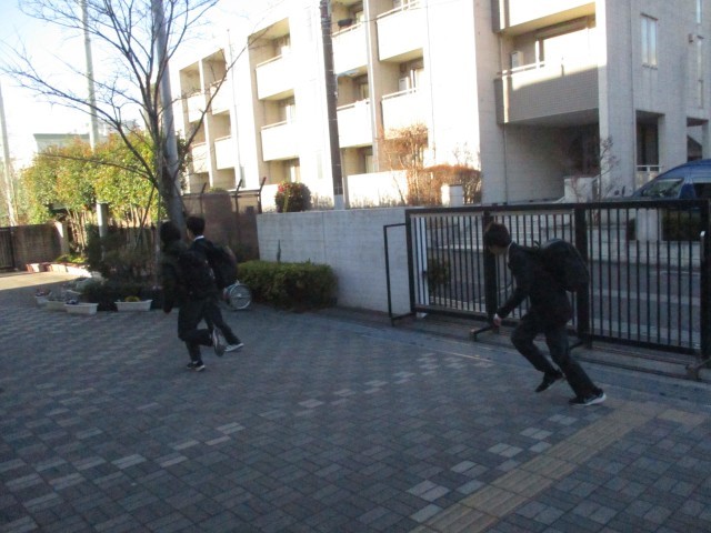 正門の時計を見て、教室めがけて走る生徒もいれば、のんびりと歩いている生徒もいます。1年で一番寒いこの時期、学校生活向上委員が寒さに耐えながら、登校する生徒に向かい、頑張ってあいさつをしてくれています。