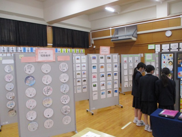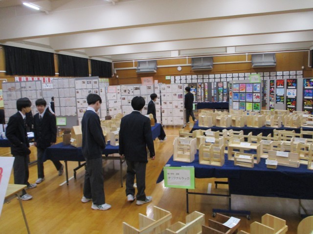 校内作品展で、作品を鑑賞している生徒の様子です。
