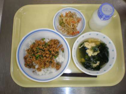 10月23日(火) 鶏そぼろ丼 卵とわかめの汁 もやしの甘酢煮 牛乳