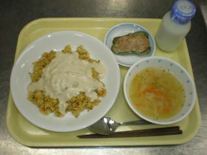 10月7日(月) カレーピラフホワイトソース添え ジュリエンヌスープ ピーマンの肉詰め焼き 牛乳