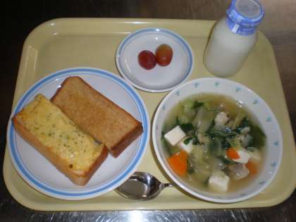 10月8日(火) 卵トースト 胚芽ニートースト 豆腐と野菜のスープ ぶどう(甲斐路) 牛乳