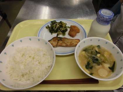 ごはん みそ汁 魚のごまみそやき きゅうりとわかめの酢の物