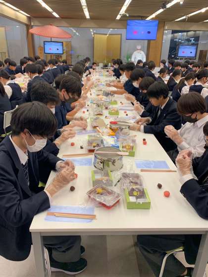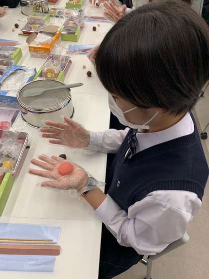 和菓子作り体験は職人の話を真剣に聞きながら一生懸命に和菓子を作っています。