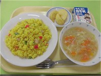 《献立》*チキンライス*チーズハムエッグ*キャベツとじゃが芋のスープ*牛乳《食材...